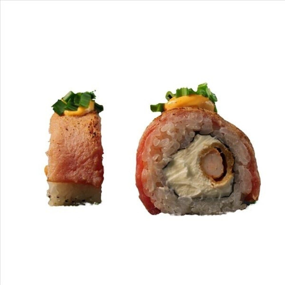 Рис, нори, сливочный сыр, тунец, креветка, лук зеленый, соус спайси