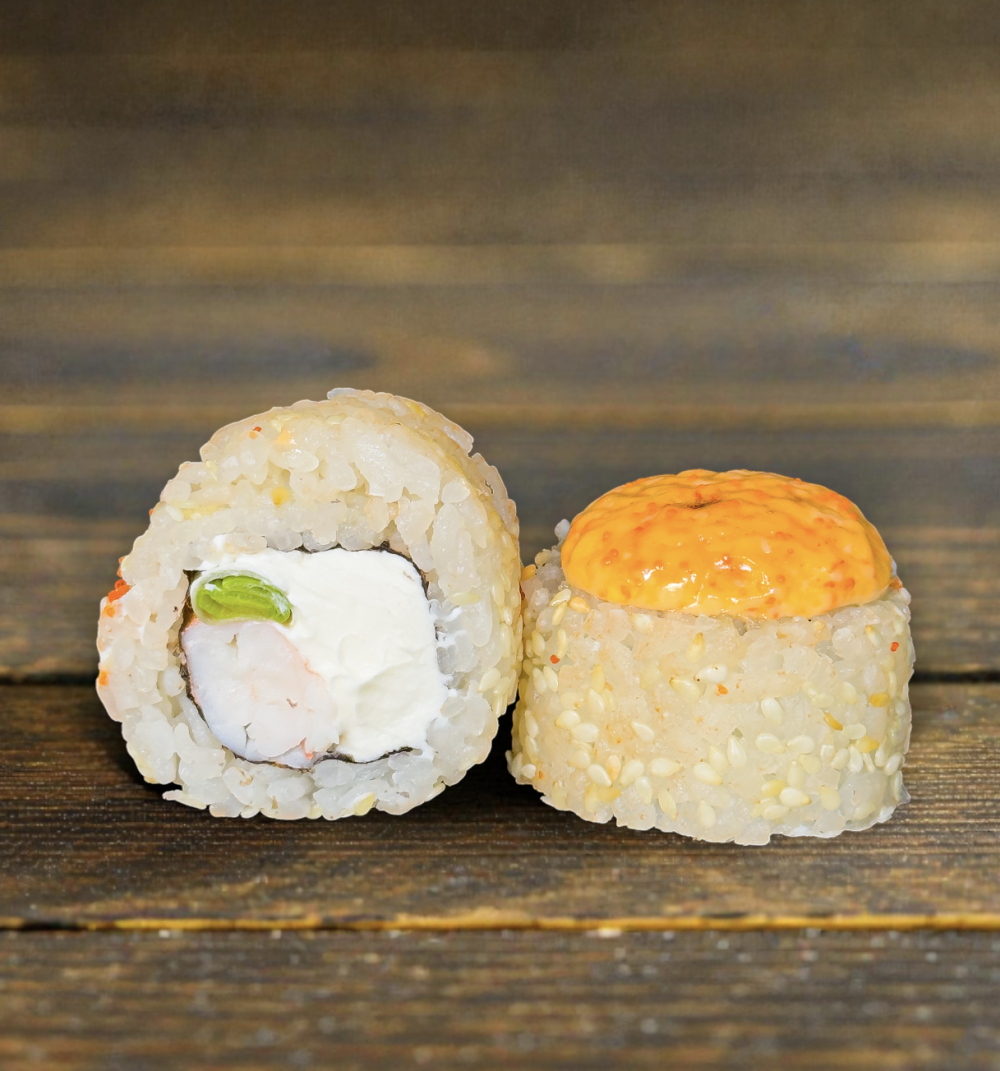 Рис, нори, сливочный сыр, креветка, Зеленый лук, кунжут, соус Яки