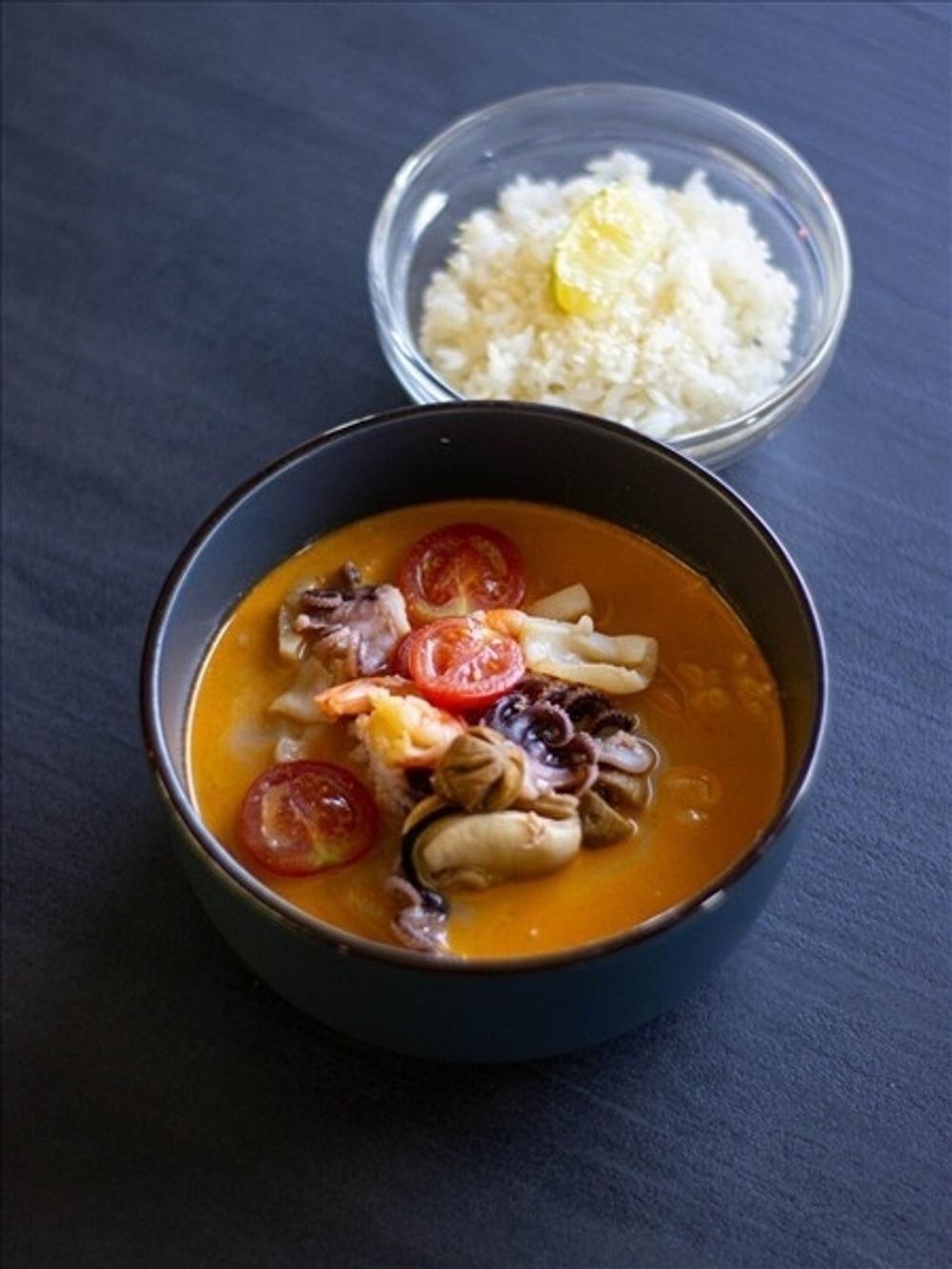 Кальмар, креветки, мидии, осьминог, помидор, грибы, кокосовое молоко, бульон, рис