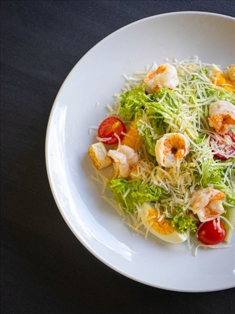 Лист салата, помидор Черри, соус Цезарь, сухари, сыр пармезан, креветка