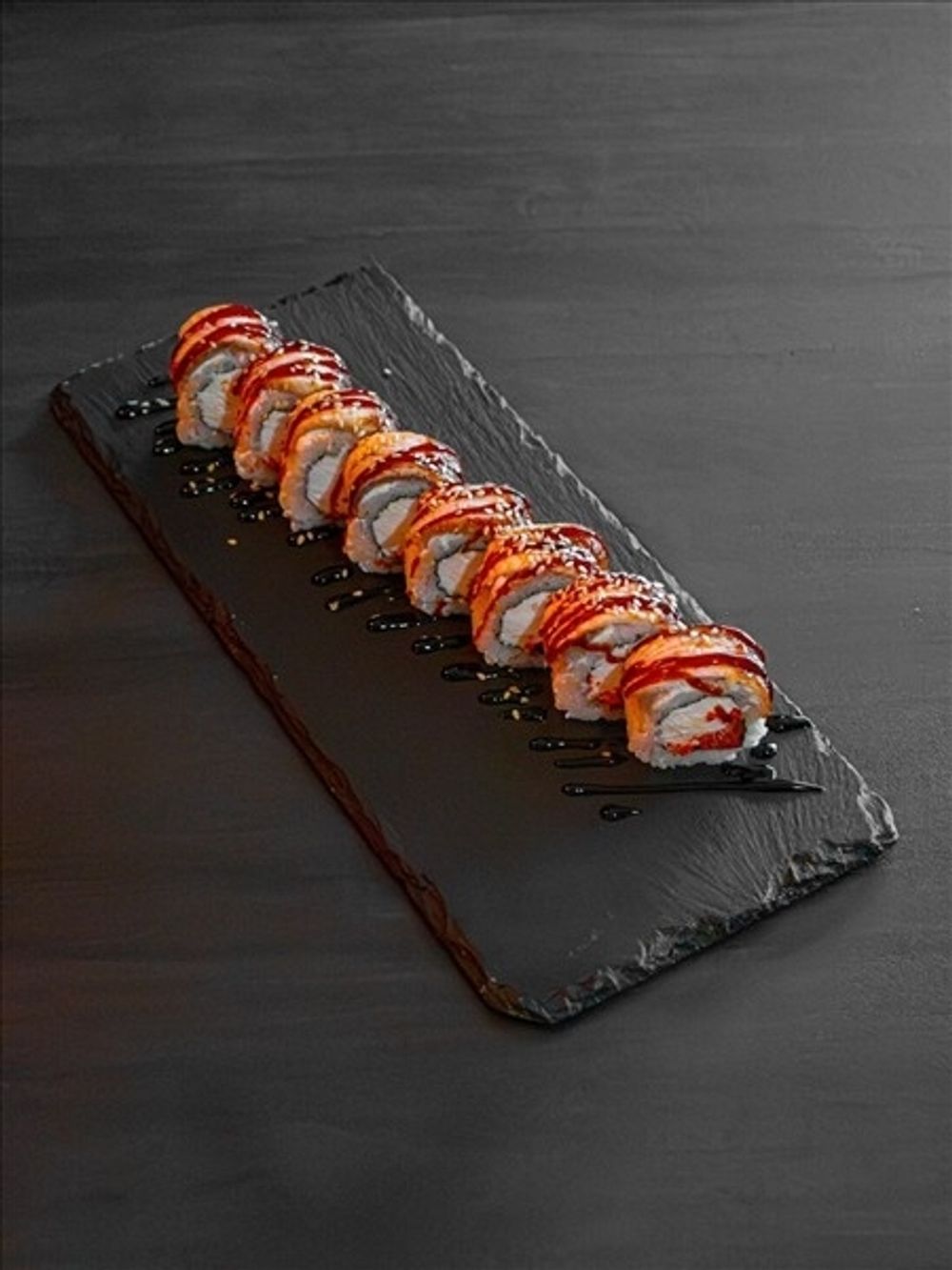 Рис, нори, сливочный сыр, лосось, икра масаго, угорь, соус унаги, кунжут