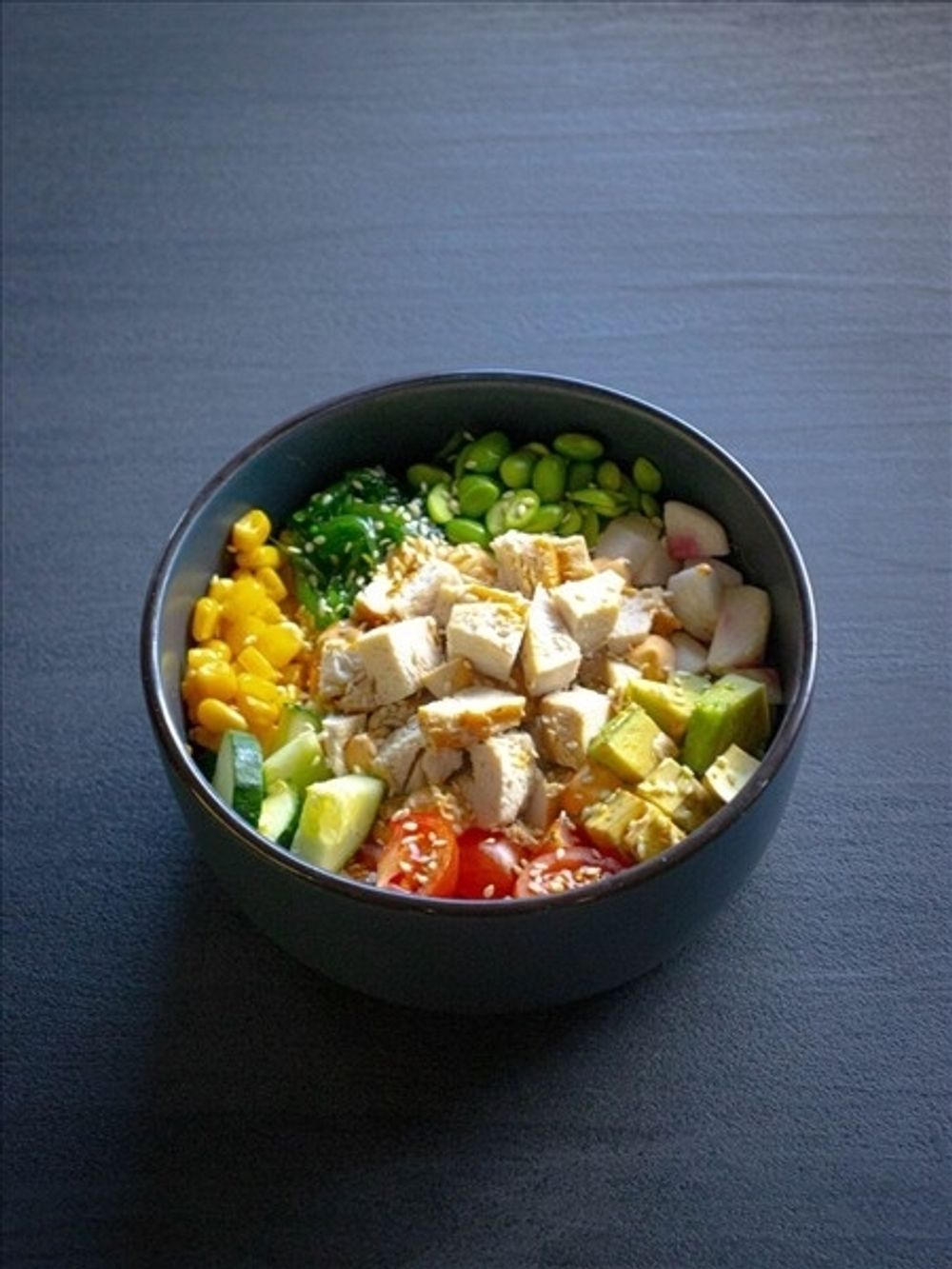 Рис, водоросли Чука, кукуруза, огурец, помидор, соус, кунжут, микс краба, курица