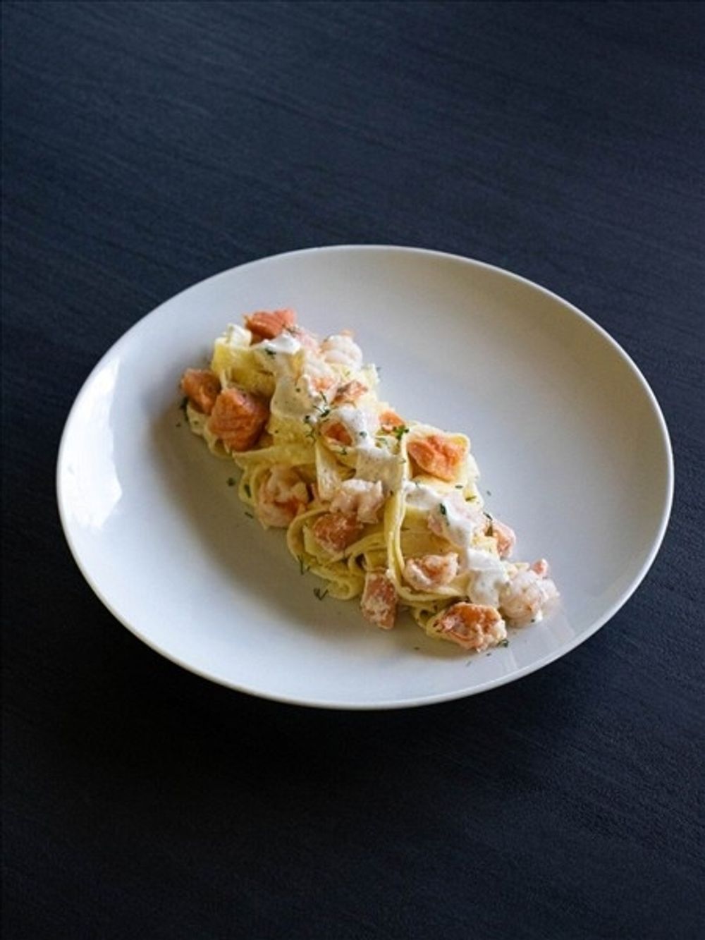 Паста с Королевскими креветками и кусочками обжаренного Лосося под сливочным соусом